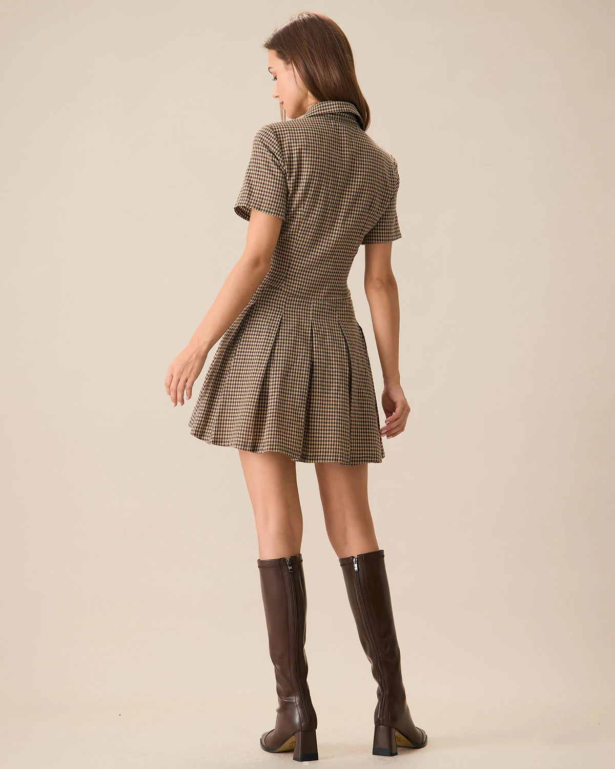 Featuring a stylish lapel collar and a timeless plaid pattern, this dress is perfect for both casual and . The pleated skirt adds a playful touch, while the tailored fit offers a flattering silhouette. The rich brown tones make it ideal for fall or winter styling.