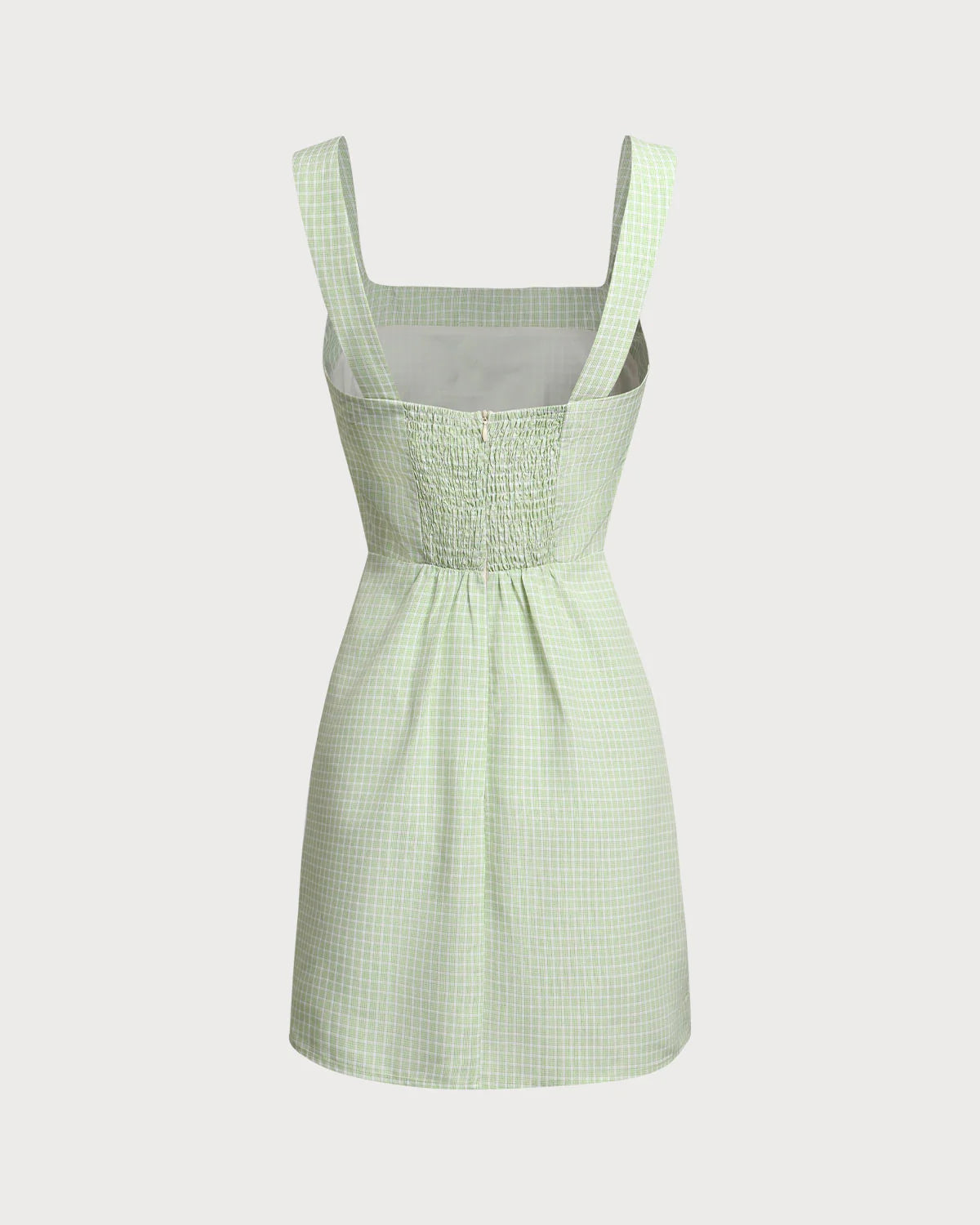 Featuring a flattering square neckline and a sleek slip silhouette, this mini dress is both playful and stylish. The green plaid pattern adds a touch of vintage-inspired flair, while adjustable straps ensure the perfect fit.
