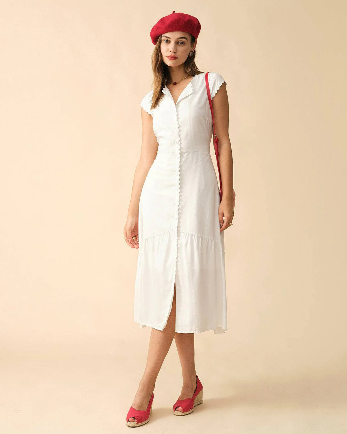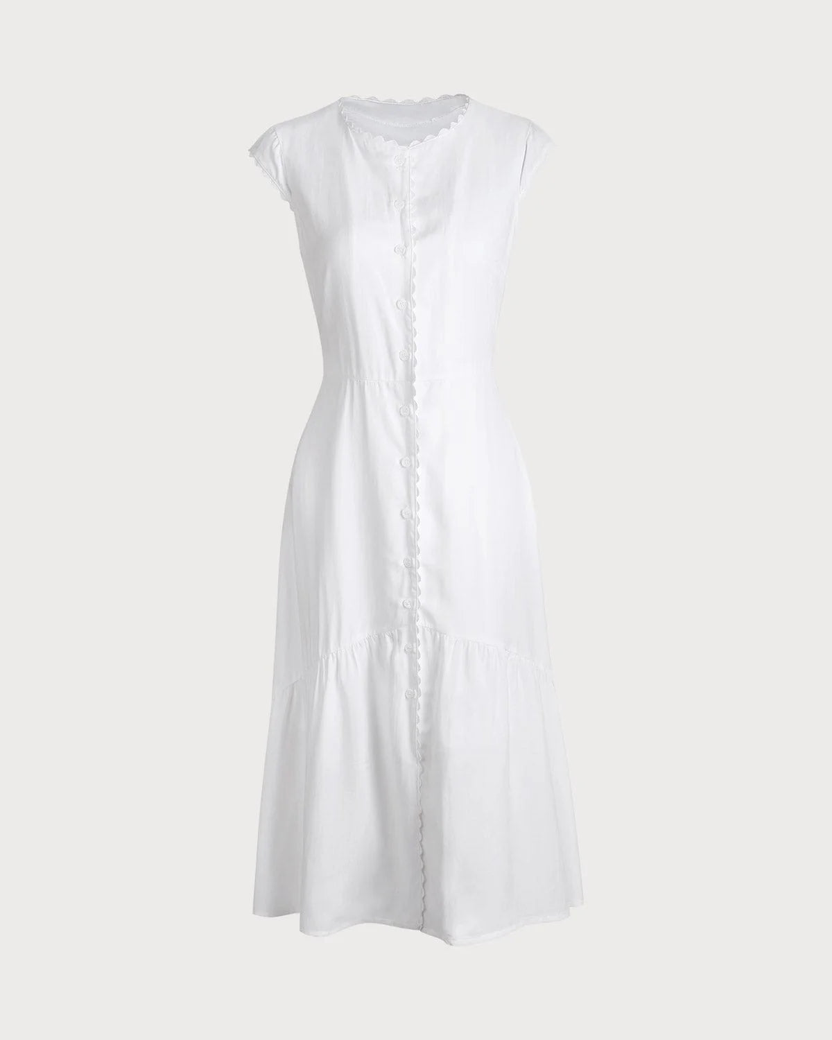 This is absolutely a gift for women for the simple cut shows female grace and gentleness to the fullest. Featuring a lapel and a v-neck, as well as the cap sleeve, the female upper part is much more stereo. Plus, the high-waisted design offers women a good figure ratio, while the ruffle trim decorates female legs and adds enough sense of design to it. The white is perfect for all occasions.