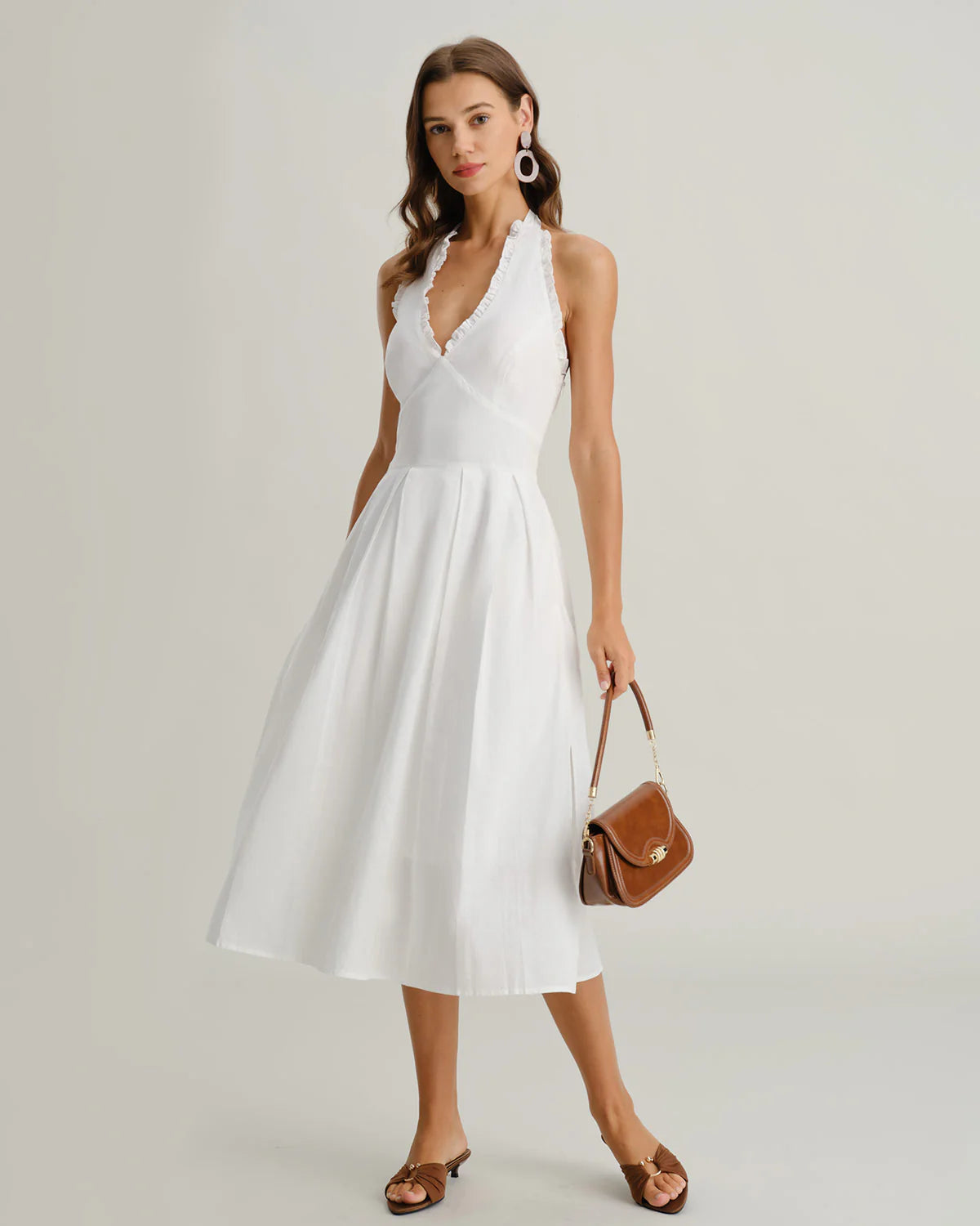 The fabric is a premium Cotton-Linen blend (90% Cotton, 10% Linen), offering the luxurious texture of linen with the softness of cotton. It breathes with you, keeping you cool on even the hottest days. The silhouette features a classic V-neck halter that showcases your shoulders and a seductive open back (backless design). The A-line skirt is finished with a playful thigh slit and subtle ruffle details, creating effortless movement as you walk.