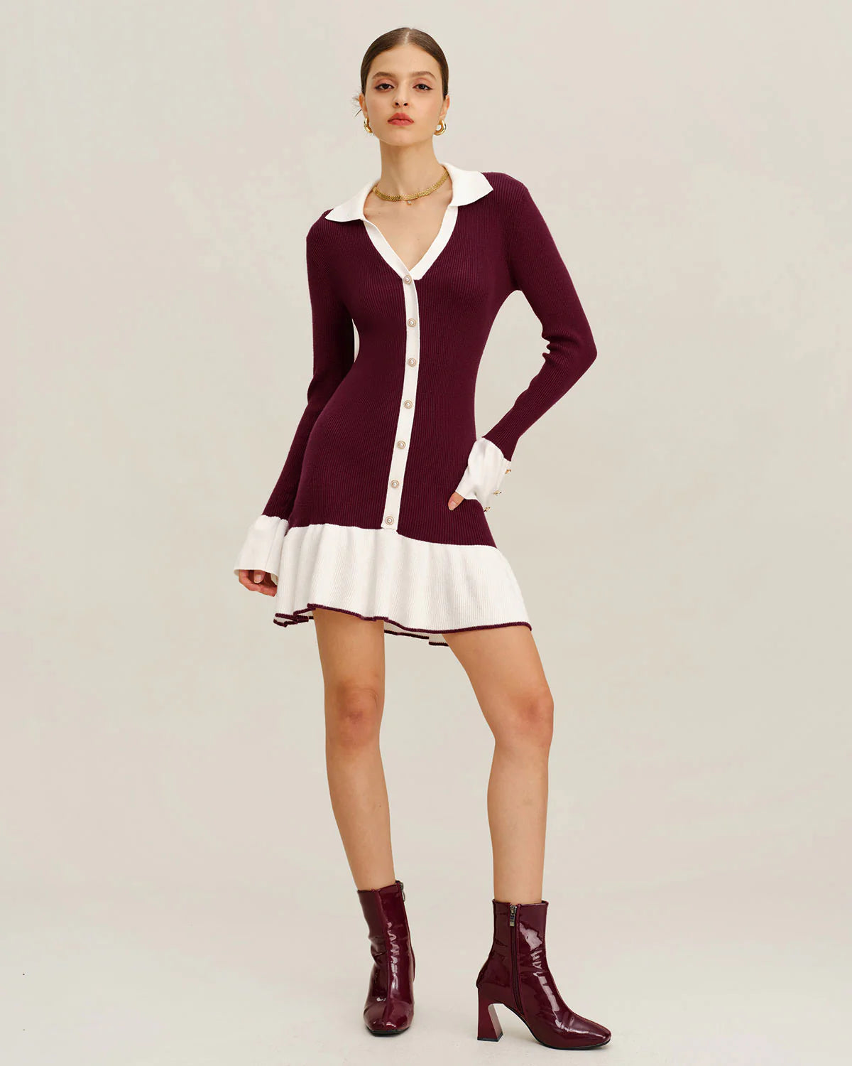 Elevate your office wear with this sophisticated . Designed for the modern professional, this piece defines fall work style. It features a chic sheath silhouette in a deep wine red, while the contrasting trim adds a sharp, curated feel. Crafted from a luxe, ribbed-knit viscose blend, this dress offers comfortable medium stretch. A classic V-neck and subtle bell sleeves add a fashionable touch to the long-sleeve design. As a versatile , it’s a one-and-done solution for polished, confident style.